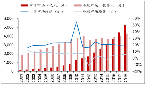 中国医疗器械市场是个高速发展的市场,目前保持良好的发展势头,2001年以来中国医疗器械市场增速非常高,期间增速普遍在20%以上,最低增速也有15%以上。2018年中国医疗器械市场规模已经达到5304亿元,增速为19.86%,远高于全球5.63%的增速;中国医疗器械市场占全球市场的占比已经从2001年不足1.5%上升至2018年的17.97%。
