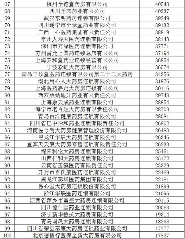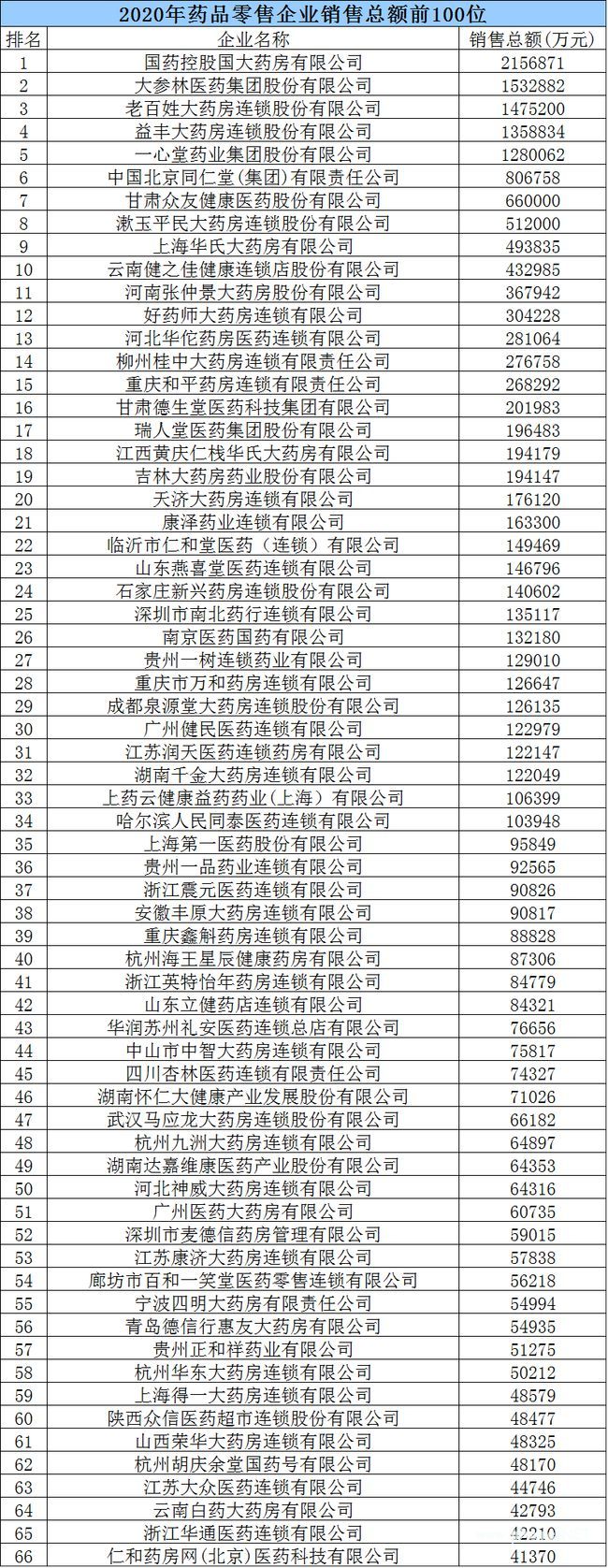 《报告》还公布了2020年药品零售企业销售总额前100位,基本为连锁药店,其中,国大药房销售额约216亿元,排名第一;大参林销售额约153亿元,排第二;老百姓销售额约148亿元,排第三。