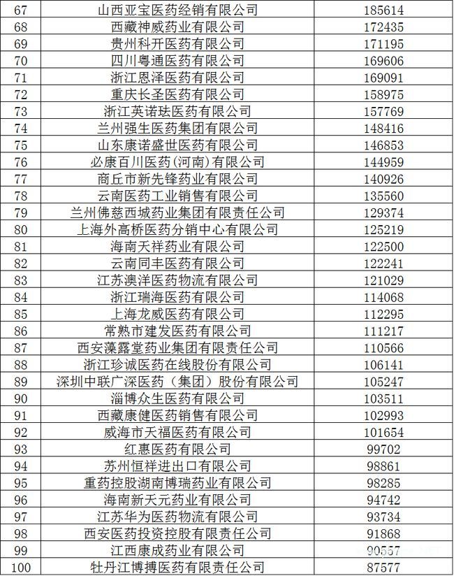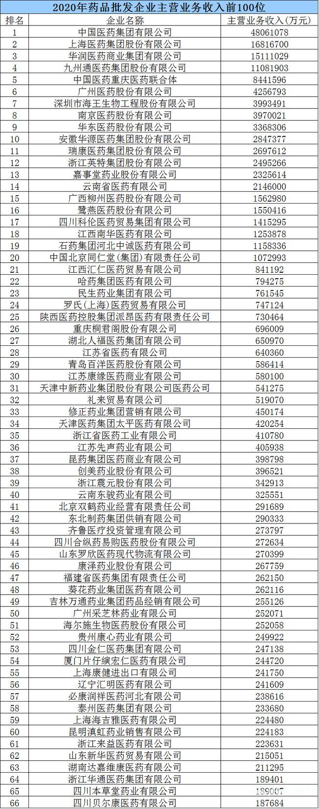 《报告》发布的2020年药品批发企业主营业务收入前100位排名中,中国医药主营业务收入约4806亿元,位列第一,上海医药主营业务收入约1682亿元,排第二;华润医药主营业务收入约1511亿元,排第三。