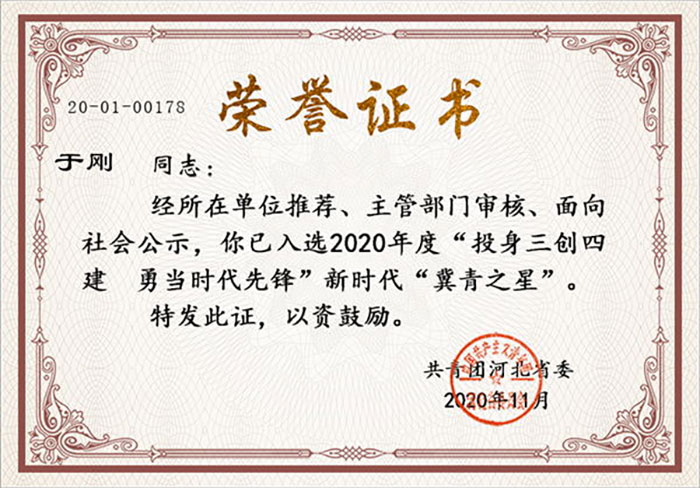 河北省中长期青年发展规划联席会议办公室,今年6月份在全省开展了“投身三创四建,勇当时代先锋”新时代“冀青之星”优秀青年典型主题选树活动。经过筛查、投票、测评,我公司总经理于刚先生荣获了2020年“冀青之星”优秀青年荣誉称号。