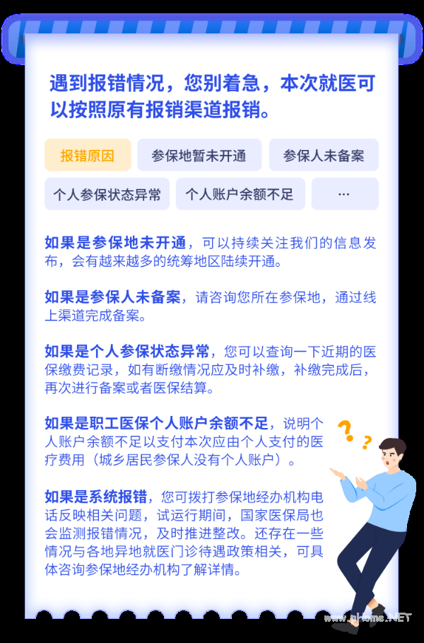如果是参保地未开通,可以持续关注我们的信息发布,会有越来越多的统筹地区陆续开通;如果是参保人未备案,请咨询您所在参保地,通过线上渠道完成备案;如果是个人参保状态异常,您可以查询一下近期的医保缴费记录,如有断缴情况应及时补缴,补缴完成后,再次进行备案或者医保结算;如果是职工医保个人账户余额不足,说明个人账户余额不足以支付本次应由个人支付的医疗费用(城乡居民参保人没有个人账户);如果是系统报错,您可拨打参保地经办机构电话反映相关问题,试运行期间,国家医保局也会监测报错情况,及时推进整改。还存在一些情况与各地异地就医门诊待遇政策相关,可具体咨询参保地经办机构了解详情。