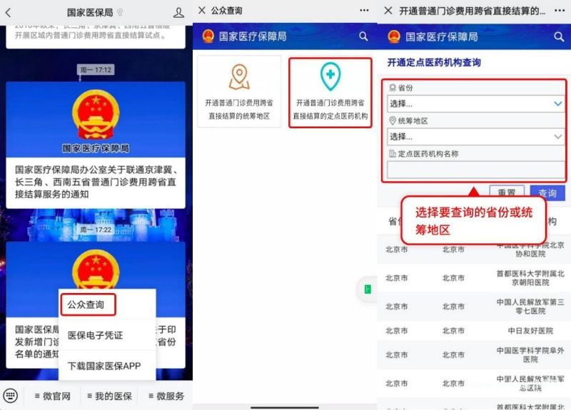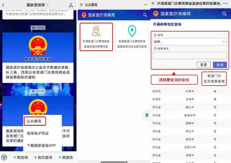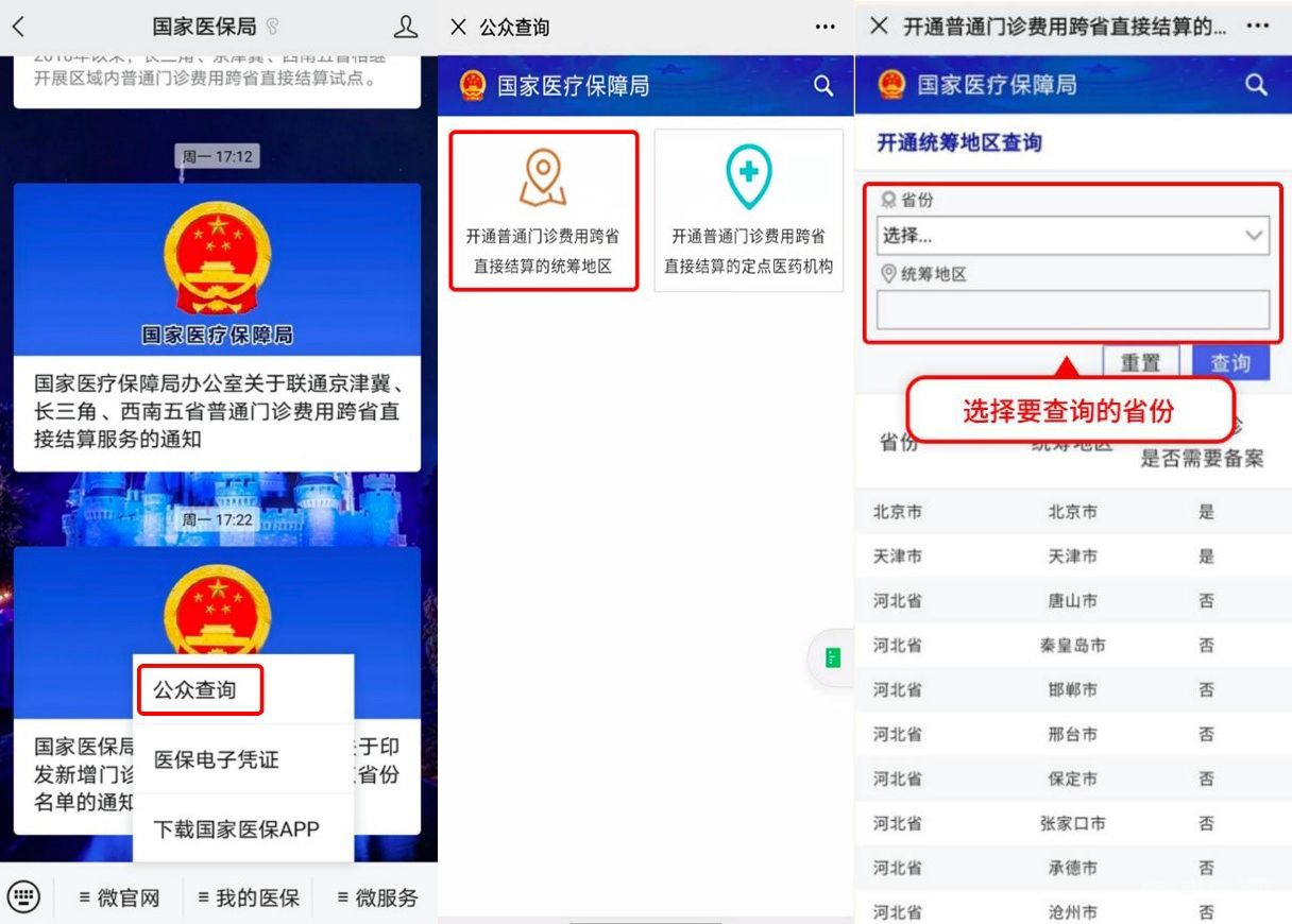 路径1:关注国家医保局公众号,点击下方导航栏中“我的医保”,选择“公众查询”,点击“开通普通门诊费用跨省直接结算的统筹地区”,选择您需要查询的省份后点击“查询”按钮,可搜索已开通的统筹地区。