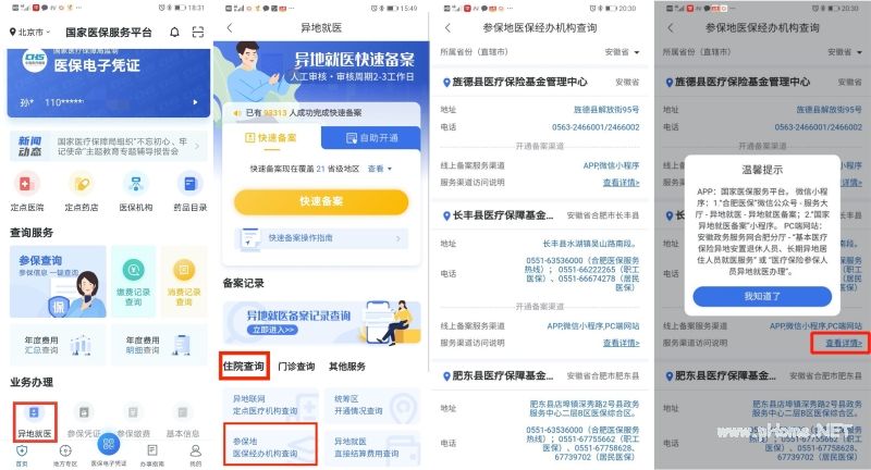 路径3:在主流应用商店下载并打开“国家医保服务平台”APP,点击“业务办理”中的“异地就医”-“住院查询”-“参保地医保经办机构查询”功能版块,了解所在参保地提供的线上备案渠道。