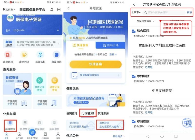 路径3:在主流应用商店下载并打开“国家医保服务平台”APP,点击“业务办理”中的“异地就医”按钮,进入异地就医页面,点击“门诊查询”按钮,进入“异地联网定点医药机构查询”,可选择相应省份、统筹地区或者搜索栏内输入某家定点医药机构的名称,查看可提供门诊费用跨省直接结算服务的定点医药机构。