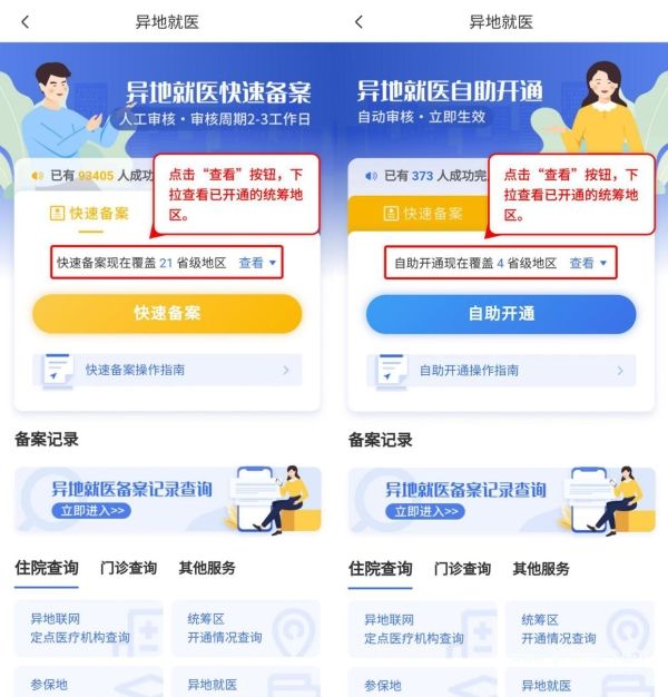 路径1:在主流应用商店下载并打开“国家医保服务平台”APP,点击“业务办理”中的“异地就医”。异地就医包含“快速备案”和“自助开通”。“快速备案”现在覆盖21省级地区,点击“查看”按钮,下拉查看已开通的统筹地区(详见“快速备案操作指南”)。“自助开通”现在覆盖4省级地区,点击“查看”按钮下拉查看已开通的统筹地区(详见“自助开通操作指南”)。