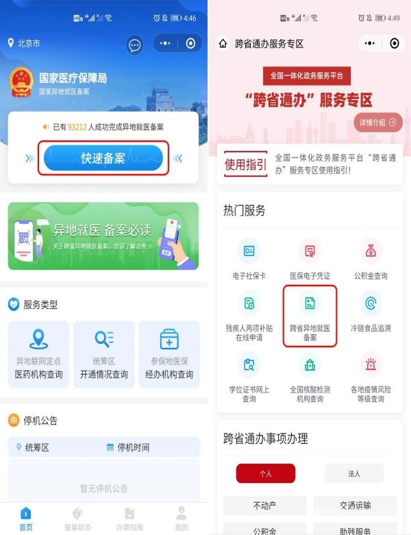 路径2:在微信小程序搜索“国家异地就医备案”,进入小程序完成“快速备案”。或者微信小程序搜索“国家政务服务平台”中“跨省异地就医备案”完成线上备案。