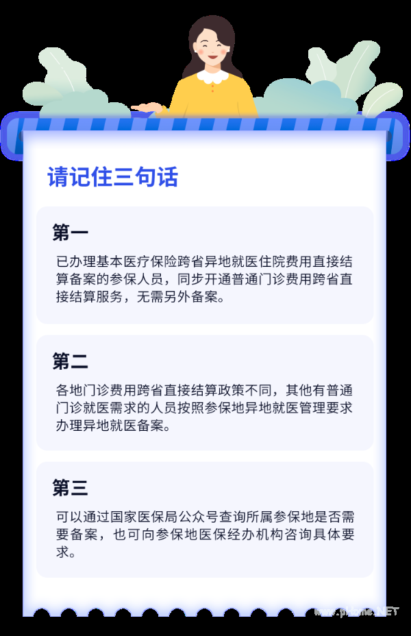 请记住三句话:第一,已办理基本医疗保险跨省异地就医住院费用直接结算备案的参保人员,同步开通普通门诊费用跨省直接结算服务,无需另外备案;第二,各地门诊费用跨省直接结算政策不同,其他有普通门诊就医需求的人员按照参保地异地就医管理要求办理异地就医备案;第三,可以通过国家医保局公众号查询所属参保地是否需要备案,也可向参保地医保经办机构咨询具体要求。