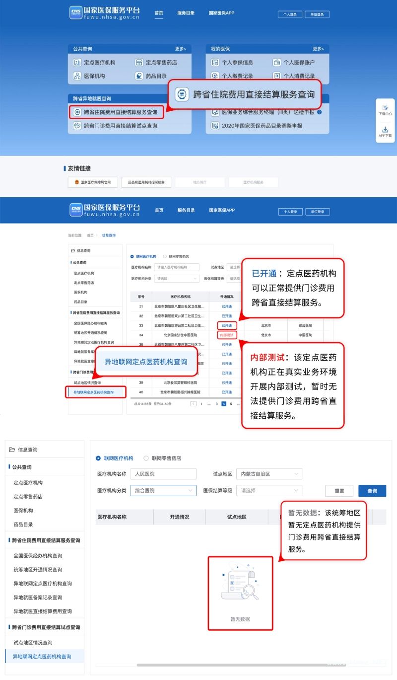 路径2:参保人可以通过国家医保服务平台网站(https://fuwu.nhsa.gov.cn)跨省异地就医查询版块查询异地联网定点医药机构。点击页面左下角“跨省门诊费用直接结算试点查询”按钮进入版块,左下角点击“异地联网定点医药机构查询”,可以按照“联网医疗机构”和“联网零售药店”类别进行检索。“开通情况”为“已开通”,说明该定点医药机构可以正常提供门诊费用跨省直接结算服务;“开通情况”为“内部测试”,说明该定点医药机构正在真实业务环境开展内部测试,暂时无法提供门诊费用跨省直接结算服务。查询情况为“暂无数据”时,说明该统筹地区暂无定点医药机构提供门诊费用跨省直接结算服务。